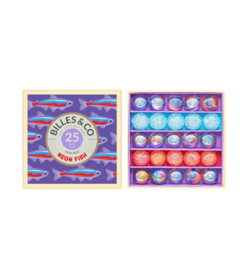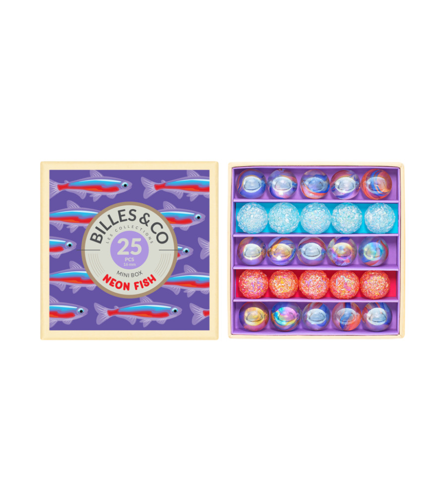 Színes lehetőség, hogy mindent megtudjon a dél-amerikai vizek mini lakójáról, amely a világ számos akváriumában otthont adott. Ez a kis vízi doboz 3 fajta golyót tartalmaz a kis Neon halak színében: világoskék, rózsaszín, átlátszó irizáló kék és vörös achát.