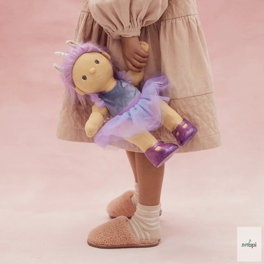• Dream Dinkum baba bársony elvitelre szánt dresszben, fix csillámos tüll tutuval és plüss, irizáló szárnyakkal, unikornis baba fejpánttal, zoknikkal és csillogó cipőkkel érkezik.