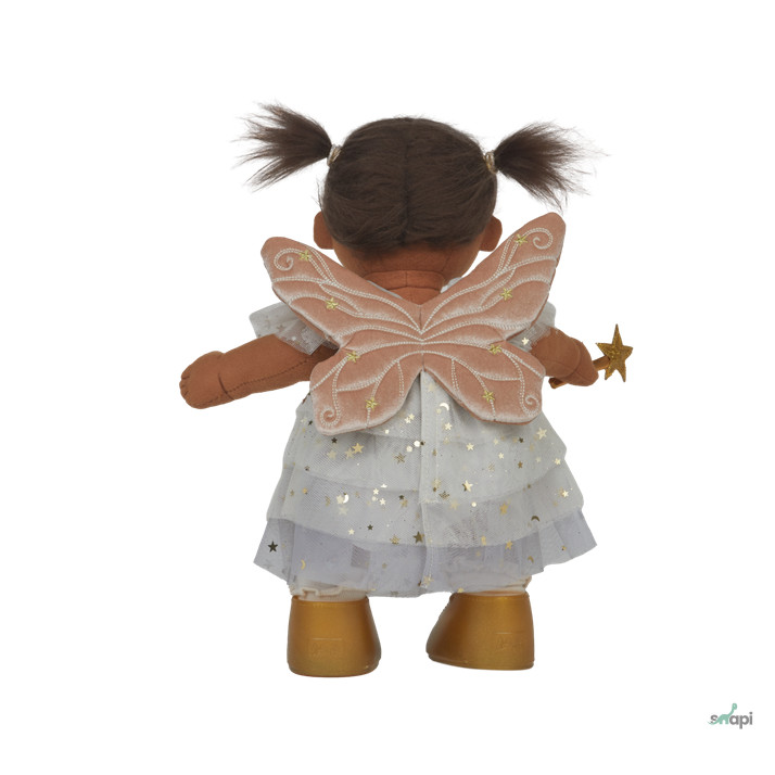 • Levehető, csillogó tüllruhában érkezik, rögzített bársony hímzésű szárnyakkal, csillogó szív alakú pálcával, fodros zoknival, pamut alsóneművel és rozéarany színű cipővel.