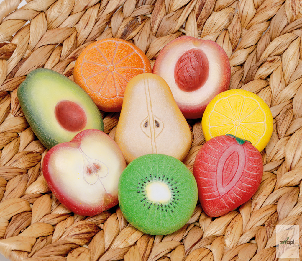 A készlet nyolc színes gyümölcsöt tartalmaz: almát, körtét, őszibarackot, epret, avokádót, kivit, narancsot és citromot. Méretek: 45-70 mm. 2 éves kortól biztonságos.