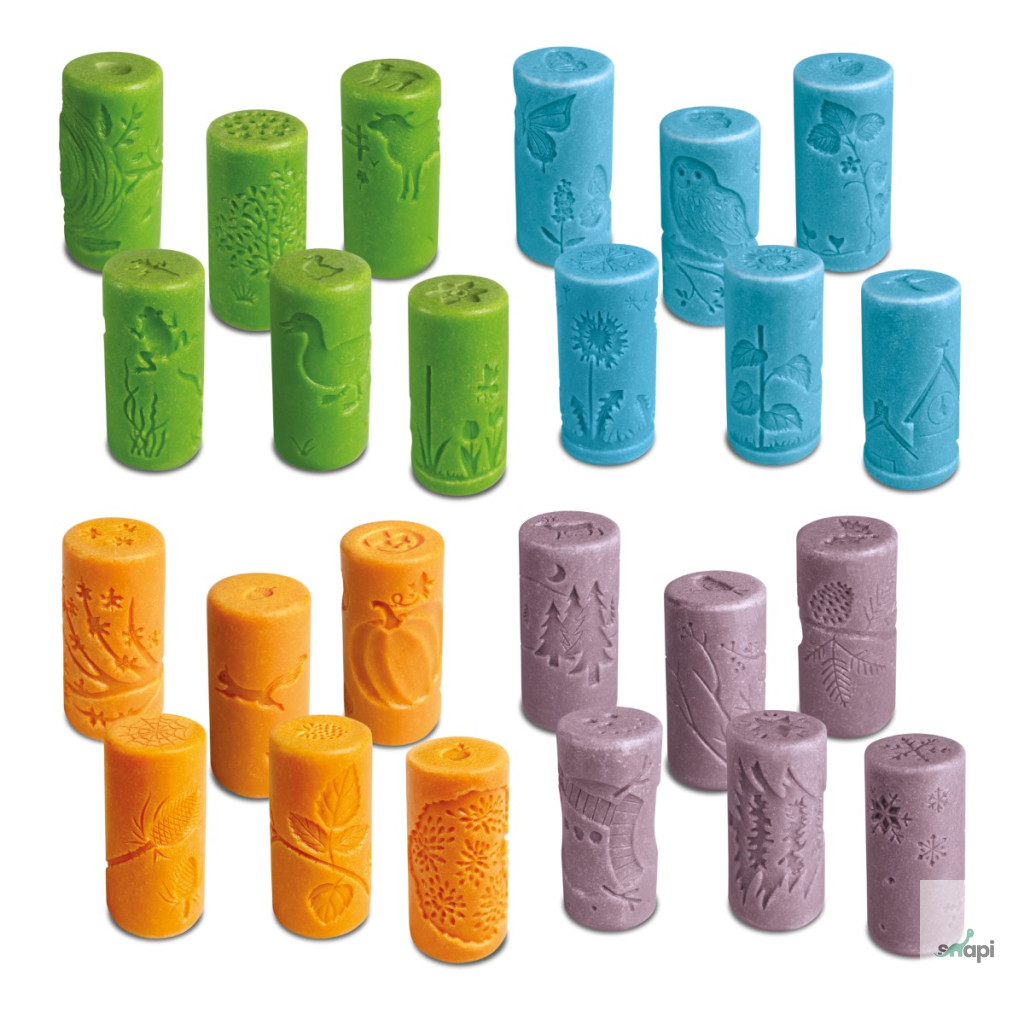 Ezek a gyönyörűen kidolgozott görgők felkeltik a gyerekek kíváncsiságát az évszakok között, fejlesztik a természettel kapcsolatos ismereteiket és megértésüket, valamint a finommotoros készségeiket. Egyszerűen sodord gyurmába, agyagba vagy homokba, és nyomdázd össze a jelenetet. További részletek derülnek ki, ahogy a gyerekek erősebben nyomják. A csomag hat tematikus görgőt tartalmaz minden évszakhoz. Ez a készlet 24 görgőt tartalmaz, amelyek végigvezetnek az éven!