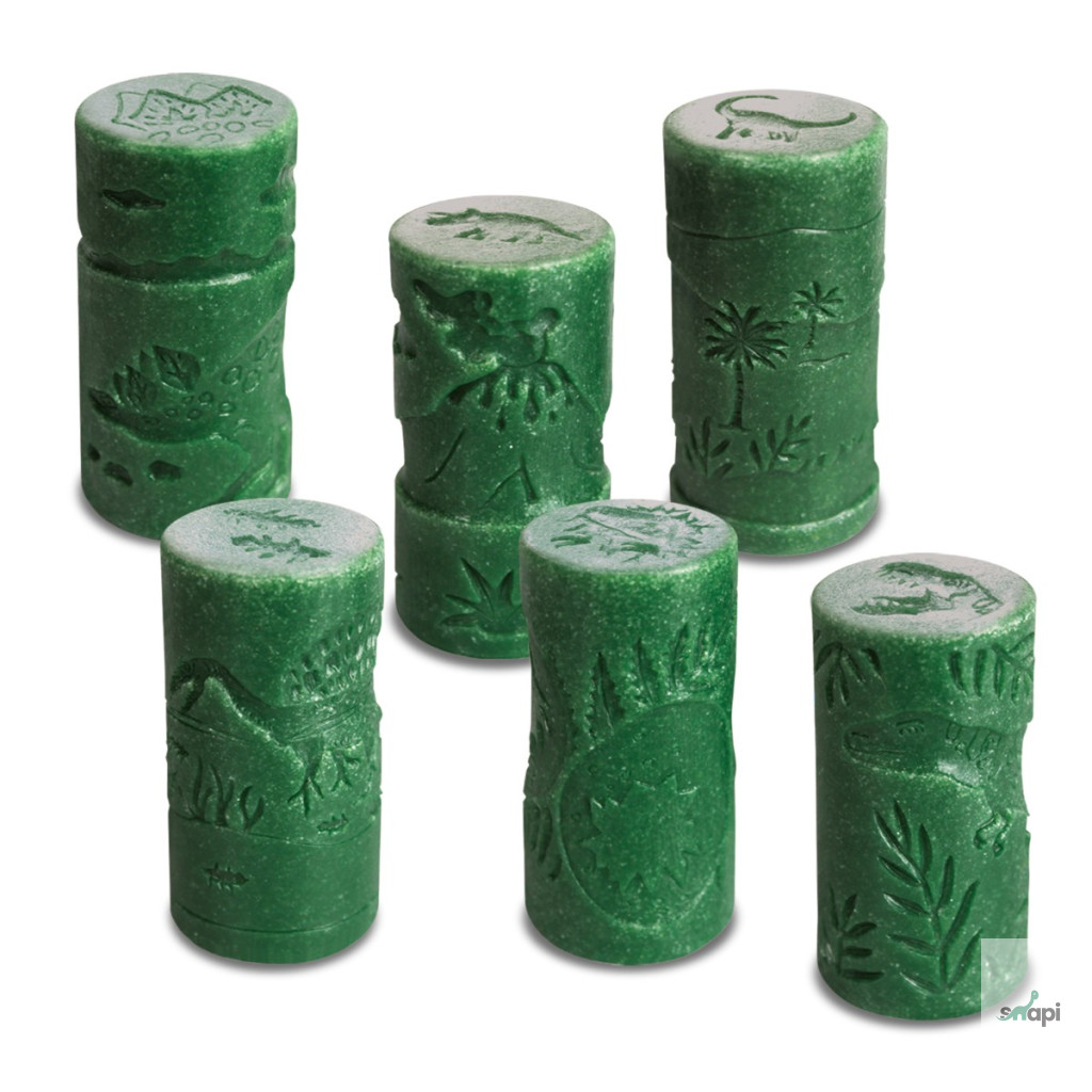 Ezek a kreatív hengerek ötletes módot kínálnak a gyerekeknek a dinoszauruszok és tájaik felfedezésére. Ideálisak a kíváncsiság felkeltésére, a tudás bővítésére és a finommotoros készségek fejlesztésére. A kihalt lények életre kelnek, miközben a gyerekek gyurmába, agyagba vagy homokba görgetik őket, és taposással csodálatos őskori jeleneteket alkotnak. A gyerekek megszámolhatják a stegosaurus tüskéit, és taposással felfedezhetik, melyik dinoszaurusz kel ki a nagy tojásokból!