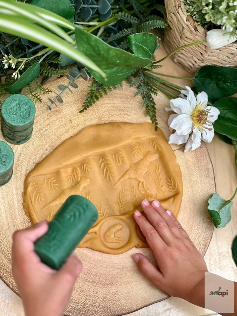 A változó nyomáserősség és a különböző hengerlési módok kísérletezésével a gyerekek játék közben fejleszthetik finommotoros készségeiket, tapintható jeleneteket alkotva kedvenc dinoszauruszaikról ősi élőhelyeiken.