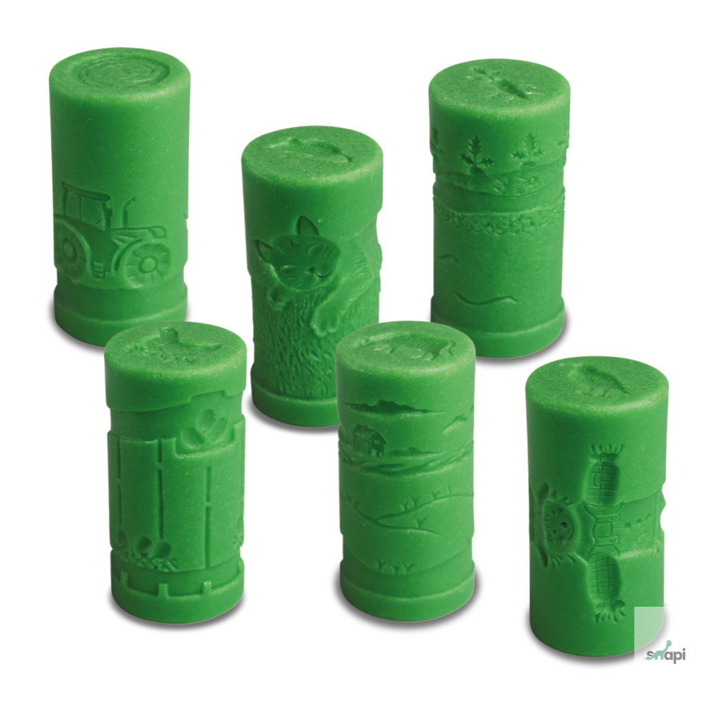 A könnyen tisztítható kőkeverékből készült készlet hat hengert tartalmaz: sárgarépa és föld, macska és egér, tehén és mező, tyúk és tyúkól, madárijesztő és varjú, valamint traktor és szénabála.